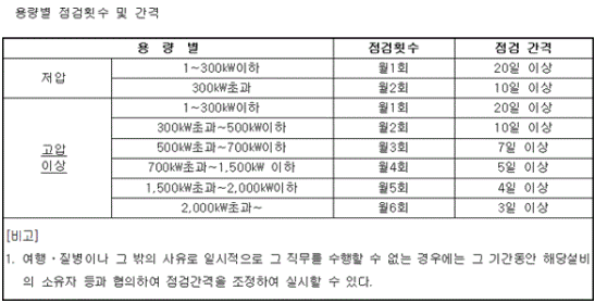 안전관리업무를 대행하는 전기안전관리자는 전기설비가 설치된 장소 또는 사업장을 방문하여 점검을 실시해야 하며 그 기준은 다음과 같다.