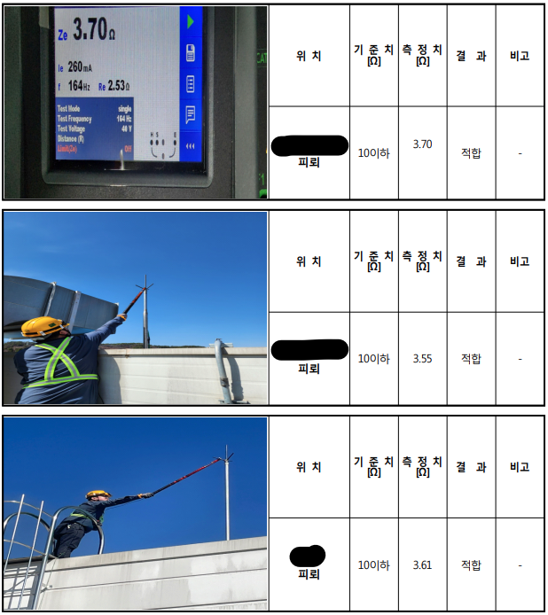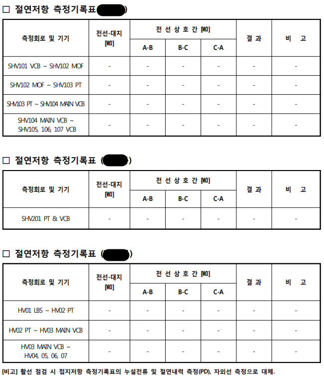 | 1) 육안, 후각, 청각 점검 사항 ① 고압기기의 변형 및 열화상태, 소음, 냄새(타는 냄새, 오존 냄새) 2) 사선에 의한 특·고압 절연저항 측정 사항 ① 최단거리 접지단자와 고압기기 단자 접속하여 값 측정 ② 측정 후에 측정부분을 항시 방전하여 인명사고 예방(주의) ③ 고압기기 측정값은 기준 값에 따라 보수 및 교체 계획 진행 3) 접지시스템 저항 값 : 활선 및 사선에 따라 시행 |