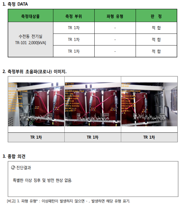 | 1) 송전선로 및 특·고압설비의 절연 저하에 따른 공기 절연파괴로 인한 코로나 방전현상에서 발생하는 초음파 신호들을 측정하여 초음파의 발생 위치 및 강도를 확인하고 발생하는 파형으로 이상유무를 판단하여 코로나 방전에서 아크방전으로 진전되는 것을 예방할 수 있도록 초음파 진단으로 심각한 사고를 미연에 방지하기 위한 목적이다. |