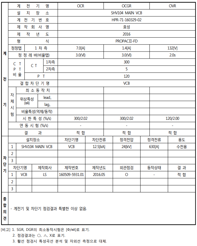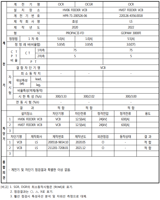| 1) 수전설비 전력계통 보호계전기 적용상태 및 계전기 특성파악 2) 수전설비 용량에 대한 정정치의 적정성 확인 3) 계전기 시한 특성시험 4) 계전기 차단기 동작시험 5) 차단기 연동시험 |