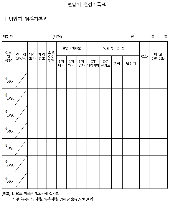 전기안전관리자의 직무에 관한 고시- [별지 4] 변압기 점검기록표
