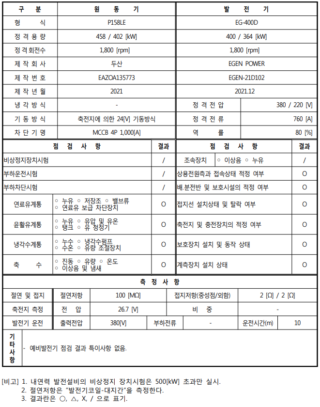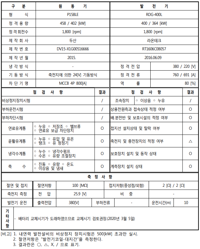 | 1) 발전기 형식 확인 2) 정격용량과 RPM 확인 3) 제조회사와 제작번호 4) 정격전압, 정격전류, 정격주파수, 역률 확인 |