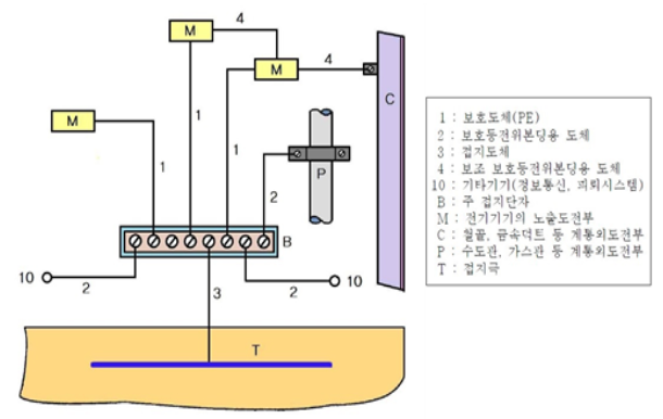 1) 공통, 통합접지시스템으로 시설된 등전위 본딩도체, 보호도체(PE) (KS C IEC 60364) 구성도