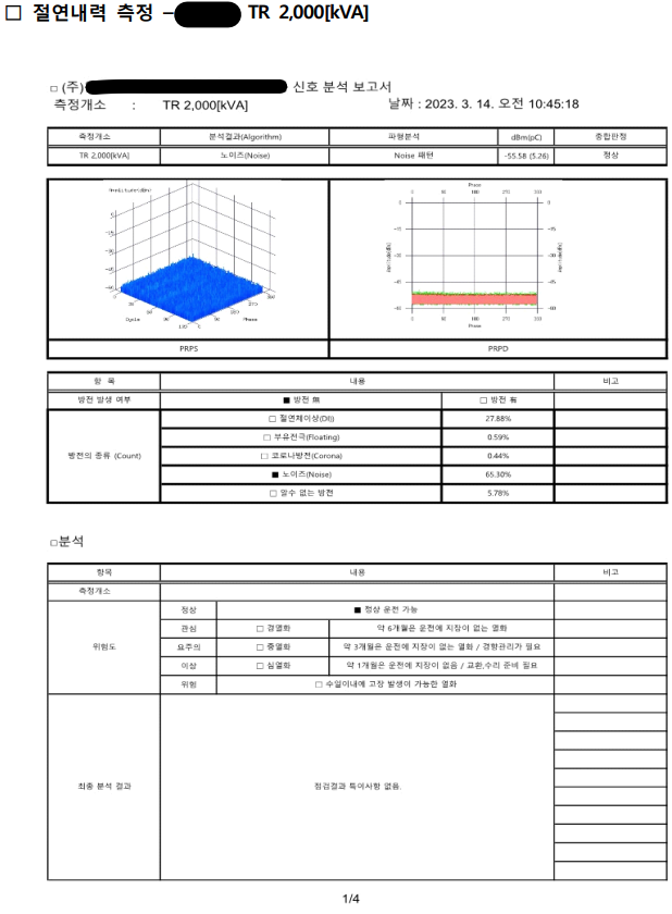| 1) 무정전 상태에서 절연체 내부공극의 국부적인 고 전계 방전의 패턴을 검출, 분석하여 기기의 절연특성과 수명을 예측하여 사고를 사전 예방 2) 정전 없이 절연내력을 측정하므로 중요부하의 전원을 끊김 없이 공급하여 전원의 신뢰성, 경제성, 생산성 향상을 목적으로 한다. |
