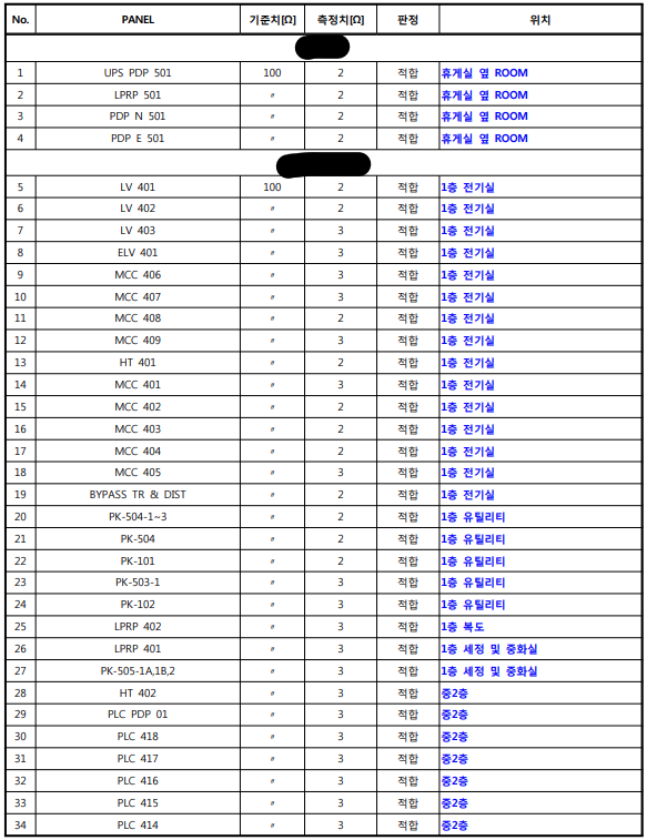 | 1) 특고압(고압) 절연저항 기준 ① 고압설비의 절연저항 측정 1000[V] 이상 메거측정 ② 고압 케이블 및 모선 절연 2000[MΩ] 이상 정상 국내기준 판정 ③ 고압기기 국내기준은 없으므로, 외국의 기준에 의거 판정 ④ 절연저항은 보통 500[MΩ] 이상 정상 값으로 인정 하나 설비 노후상태, 스트레스 값 등을 지표로 보수 및 교체 판정 합니다. (설비자료 검토판정) 2) 단독 접지 공사방식(접지선 굵기)에 따른 기준치 및 작용개소 3) 공통·통합 접지저항 ① 특·고압 계통 지락 사고 시 발생하는 고장전압이 저압기기에 인가되어도 인체안전에 영향을 미치지 않는 허용접촉전압 값 이하가 되도록 한 접지저항 값 (KS C IEC 60364V-4-44) ② 인체 허용접촉전압에 의한 접지계산서의 접지저항 값을 확인 후 측정 ③ 일반적인 접지저항 요구사항 (IEEE 80(2000)) 송전용, 변전소, 발전소 접지저항 값 : 1[Ω] 이하 플랜트, 빌딩, 상업용 시설물 접지저항 값 : 1[Ω] ~ 5[Ω] 범위 4) 공통·통합 접지선, 보호도체 및 등전위본딩 도체 단면적 ① 접지도체(보호도체 포함)의 최소면적 확인 ② 지중에 매설하는 경우의 접지선 최소단면적 확인 |