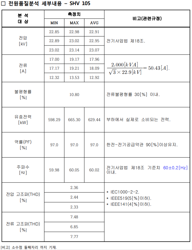 | 1) 전력계통의 전원품질을 측정하여 국제 규격과 비교검토 2) 전압품질 : 전압저하, 전압상승, 고조파 차수 파형분석 3) 주파수 : 한전 공급자의 주파수 허용 변동분석 4) 불평형 전류 : 불평형 전류의 추이 변동분석 5) 전원품질 요소를 측정하여 전원공급의 안정성 및 신뢰성 향상증진 |
