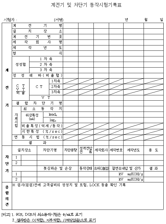 전기안전관리자의 직무에 관한 고시- [별지 5] 계전기 및 차단기 동작시험기록표