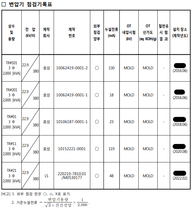| 1) 변압기의 온도, 진동, 소음, 외관 변형 점검 2) 변압기의 고, 저압 케이블 접속 상태 점검 3) 변압기의 절연저항 및 이상 누설전류 점검 4) 변압기 절연유 내압시험, 산가도 측정 |