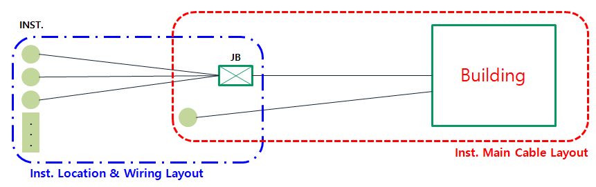 공장에 설치되는 계기 위치 등을 조사하여, 계기 Arrange를 통해 Junction box 설치 위치 및 Multi Cable의 경로 및 Cable Spec.을 표시한 도면이다.