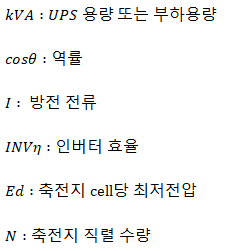 UPS Battery 용량 계산은 UPS 용량, 축전지 셀 수량, 축전지 용량, K-Factor 등에 의해 계산할 수 있다.