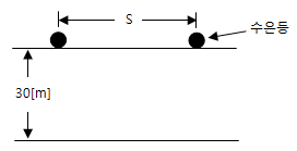 문제 11) 그림과 같이 폭 30 [m]인 도로 양쪽에서 지그재그 식으로 300 [W]의 고압 수은등을 배치하여 도로의 평균 조도를 5 [lx]로 하자면, 각 등의 간격 S [m]은 얼마가 되어야 하는가? (단, 조명률은 0.32, 감광 보상률은 1.3, 수은등의 광속은 5500 [lm]이다.)
