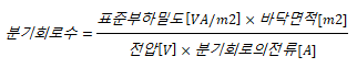 | 참고 : 분기 회로수 결정 시 등기구의 전류가 주어지면 다음과 같이 계산하여 구한다. ![]() 분기 회로수 계산 결과값에 소수점이 발생하면 소수점 이하 절상한다. |