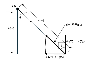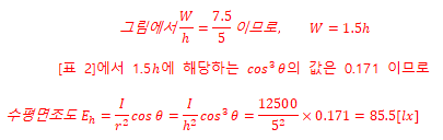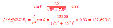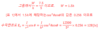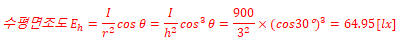 문제 1) 각 방향에 900 [cd]의 광도를 갖는 광원을 높이 3 [m]에 취부 한 경우 직하로부터 30°방향의 수평면 조도[lx]를 구하시오.