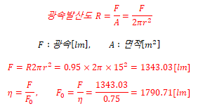문제 2) 지름 30 [cm]인 완전 확산형 반구형 전구를 사용하여 평균 휘도가 0.3 [cd/cm2]인 천장등을 가설하려고 한다. 기구 효율을 0.75라 하면, 이 전구의 광속은 몇 [lm] 정도이어야 하는지 계산하시오. (단, 광속 발산도는 0.95 [lm/cm2]라 한다.)