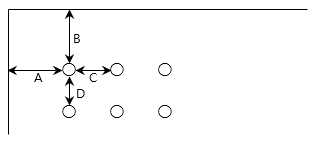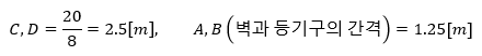 (3)등간의 간격과 최외각에 설치된 등기구와 건물 벽간의 간격(A, B, C, D)은 각각 몇 [m]인가?