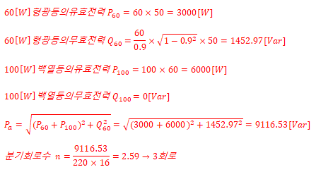문제 13) 사용전압 220 [V]인 옥내 배선에서 소비전력 60 [W], 역률 90 [%]인 형광등 50개와 소비전력 100 [W]인 백열등 60개를 설치하려고 할 때 최소 분기 회로수는 몇 회로인가? (단, 16 [A] 분기회로로 한다.)