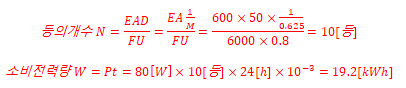 문제 7) 평균 조도 600 [lx]인 전반조명을 시설한 50 [m2]의 방이 있다. 이 방에 조명기구 1대당 광속 6000 [lm], 조명률 80 [%], 유지율 62.5 [%]인 등기구를 설치하려고 한다. 이때 조명기구 1대의 소비 전력을 80 [W]라면 이 방에서 24시간 연속 점등한 경우 하루의 소비전력량은 몇 [kWh]인가?