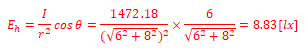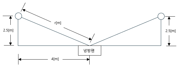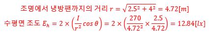 문제 5) 가로 8 [m], 세로 3 [m]인 냉각탑에 높이가 2.5 [m]인 조명 두 개가 8 [m] 간격을 두고 있다. 냉방팬 정중앙에서의 수평면 조도를 구하시오. (단, 광원에서 중앙 쪽으로 향하는 광도는 27 [cd]이다.)