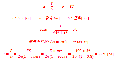 문제 6) 그림과 같은 점광원으로부터 원뿔 밑면까지의 거리가 4 [m]이고, 밑면의 반지름이 3 [m]인 원형면의 평균 조도가 100 [lx]라면 이 점광원의 평균 광도[cd]는?
