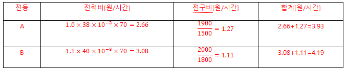 문제 7) 다음의 A, B 전등 중 어느 것을 사용하는 편이 유리한지 다음 표를 이용하여 산정하시오. (단, 1시간당 점등 비용으로 산정할 것)
