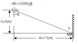 문제 2) 그림과 같이 높이 5 [m]의 점에 있는 백열전등에서 광도 12500 [cd]의 빛이 수평거리 7.5 [m]의 점 P에 주어지고 있다. 다음 각 물음에 답하시오.