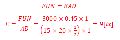 문제 10) 폭 15 [m]의 무한히 긴 가로의 양측에 간격 20 [m]를 두고 수많은 가로등이 점등되고 있다. 1등당의 전광 속은 3000 [lm]으로, 45 [%]가 가로 전면에 방사하는 것으로 하면 가로면의 평균조도[lx]는 얼마인가?