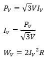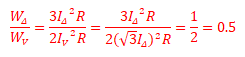 (3) Δ결선 시의 동손을 WΔ, V결선 시의 동손을 WV라 하였을 때 WΔ/WV를 구하시오. (단, 변압기는 단상 변압기를 사용하고 부하는 변압기 V결선 시, 과부하시키지 않는 것으로 한다.)