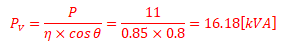 단상 변압기 2대로 V결선하여 출력 11 [kW], 역률 0.8, 효율 0.85의 3상 유도 전동기를 운전하려고 한다. 이 경우 변압기 한 대의 용량을 구하시오.