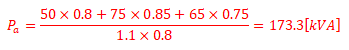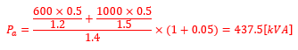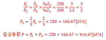 | 참고 : - 임피던스가 같다면 250+200=450[kVA]가 된다. - 부하분담비 공식 ![]() - Pa 계산 시, 변압기 용량을 초과하게 된다. |