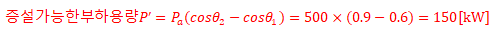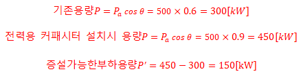 용량이 500 [kVA]인 변압기에 역률 60 [%](지상), 500 [kVA]인 부하가 접속되어 있다. 부하에 병렬로 전력용 커패시터를 설치하여 역률을 90 [%]로 개선하려고 할 때, 이 변압기에 증설할 수 있는 부하 용량 [kW]을 계산하시오. (단, 증설 부하의 역률은 90 [%]이다.)
