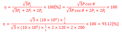 용량 10 [kVA], 철손 120 [W], 전부하 동손 200 [W]인 단상 변압기 2대를 V결선하여 부하를 걸었을 때, 전부하 효율은 몇 [%]인지 구하시오. (단, 부하의 역률을 1/2이다.)
