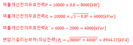 역률 80 [%], 10000 [kVA]의 부하를 가진 변전소에 2000 [kVA]의 콘덴서를 설치하여 역률을 개선하면 변압기에 걸리는 부하는 몇 [kVA]인가?