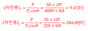 (2) 2차에 50 [kW], 진상 역률 0.8인 부하를 연결할 경우, 1차 전류 및 2차 전류를 구하시오.