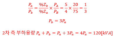 (2) 2차 측의 부하용량이 120 [kVA] 일 때 각 변압기가 분담하는 전력은 얼마인가?