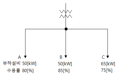 그림과 같이 부하가 A, B, C에 시설될 경우, 이것에 공급할 변압기 Tr의 용량을 계산하여 표준 용량을 선정하시오. (단, 부등률은 1.1, 부하 역률은 80 [%]로 한다.)