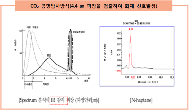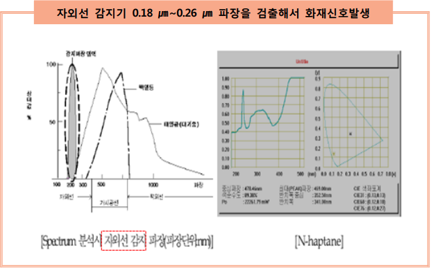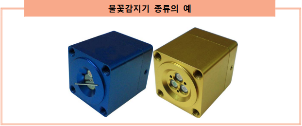 1. 불꽃감지기 종류는 적외선과 자외선 또는 이들 두 가지 기능이 혼합되어져 있는 감지기로 분류된다.불꽃감지기는 화재로부터 발생 가능한 전자복사파 에너지가 불꽃감지기에 도달하여야 작동하게 된다. 가시거리 범위 내에서는 불꽃의 직사방열이 이를 증명한다. 적외선 불꽃감지기는 열 방출의 직사 복사선이 차단된다 하더라도 금속표면에서 반사되어 감지하는 성능을 유지할 수 있다.그러나 자외선 불꽃감지기는 자외선 특성상 반사되지 아니하거나 또는 좀처럼 반사되지 아니하기 때문에 상기와 같이 차단되는 경우에는 효과가 없다.직사형 열적외선은 항상 우회형 열적외선보다 몇 배 더 강하다는 것을 알아야 한다. 따라서 불꽃감지기는 항상 감시지역 전체가 가시범위에 포함되도록 설치되어야 한다.그리하여 불꽃감지기는 실내의 높은 모퉁이 위치에 설치하는 것이 오히려 더 좋다. 2. 불꽃감지기는 옥내형, 옥외형 및 도로형이 있으며 특수장소에 설치할 수 있는 방폭형, 내산형 및 내알카리형 있으므로 방호대상물의 용도에 적합한 감지기를 선택하여 설치하여야 한다. 또한, 불꽃감지기의 감지포용범위는 아래 그림에서 보는바와 같이 원추형의 형태를 구성하고 있으며, 시야각이 넓은 감지기는 그만큼 감지면적이 넓어지고 감지거리가 길수록 높은 천정에 사용할 수 있게 된다.불꽃감지기중 도로형은 최대시야각이 180° 이상이어야 한다. 3.불꽃감직기 중 적외선감지기(IR)는 IR, IR3, IR5 등의 표기 되어 있으며 이는 적외선 센서의 수량(1개, 3개 등)으로 각각의 센서마다 측정하는 주파수 범위를 다르게 하여 화재감시의 신뢰도를 높인 것이다.