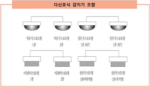 2. 다신호방식의 감지기는 하나의 감지기에서 2개 이상의 신호가 수신기로 송출할 수 있도록 제작된 감지기이므로 이와 같은 기능을 수행할 수 있는 수신기를 설치하여야 한다. 가. 다신호식감지기는 1개의 감지기내에 서로 다른 종별 또는 감도 등의 기능을 갖춘 것으로서 일정시간 간격을 두고 각각 다른 2개 이상의 화재신호를 발하는 감지기를 말한다 예를들어 60℃와 80 ℃를 구성한 정온식 다신호식감지기는 60 ℃와 80 ℃에서 신호를 두 번 발신하게 된다. 나. 감지기의 종류는 다음과 같다.