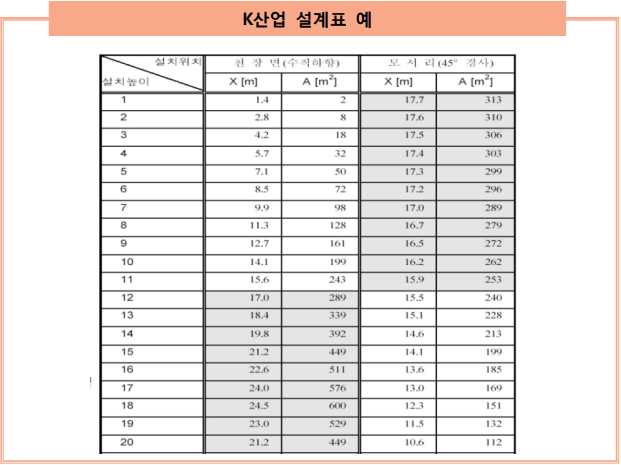 1. 불꽃감지기는 양질의 전원이 공급되지 않을 경우 감지기 성능에 영향을 줄 수 있어서 불꽃감지기 전원을 별도로 공급한다. 따라서 정전시에도 불꽃감지기가 정상적으로 화재를 감시할 수 있도록 화재안전기준에 적합한 전원반(예비전원 포함)을 설치해야 한다. 2. 불꽃감지기의 수량 산출예시(K업체 설계 사례임)가) 불꽃감지기의 성능은 시야각과 공칭감시거리로써 표현되고, 소방산업기술원의 형식승인을 기준으로 할경우 감지할 수 있는 공간을 감지기 전면부를 꼭지점으로 하는 바닥면이 반구인 원뿔모양(흔히 먹는 아이스크 림콘의 모양)이 된다. 따라서 이러한 화재감지가능 공간의 특성을 고려하여 설치공간의 구조에 따라 적절히 감지기 설치 위치와 감지방향을 선택해야 한다. 나) 천장높이가 낮은 공간(감지기의 정면을 45°경사지게 설치) 천장이 낮은 공간에서는 하나의 불꽃감지기로 가능한 넓은 공간을 감지하기 위해서는 모서리에 설치하는 것이 좋으며, 감지되는 바닥과 천장면의 감지면적이 다르므로 좁은 바닥면적을 기준 으로 설치면적을 설계하여야 한다. 모서리에 설치된 불꽃감지기의 경우 아래 부채꼴면적을 감지하지만, 사각형 모양을 기준으로 설계하는 것이 편리할 뿐만 아니라, 일부 감지면적이 중첩되므로 안전성을 높일 수 있다. 3) 천장높이가 높은 공간(감지기의 정면을 수직하향 방향으로 설치)천장이 높은 공간을 유효하게 감지하기 위해서는 천장면에 설치하여 아래로 바라보게 하는것이 좋으며, 천장의 높이(Ho)따라서 감지되는 바닥면적이 다르므로 바닥감지면적을 기준으로 설치 면적을 설계하는 것이 바람직하다. 불꽃감지기의 경우 아래 우측의 그림과 같이 부채꼴의 감지특성을 가지므로 천장과 바닥의 거리에 따라 감지면적이 달라진다. 어느 정도 거리까지는 감지기와 바닥까지의 거리에 따라 바닥감지면적이 증가하지만 특정거리를 지나면 오히려 감소하는 특성이 있다. 바닥감지영역도 원형 모양이지만, 사각형 모양을 기준으로 설계하는 것이 편리할 뿐만 아니라, 일부 감지면적이 중첩되므로 안전성을 높일 수 있다.