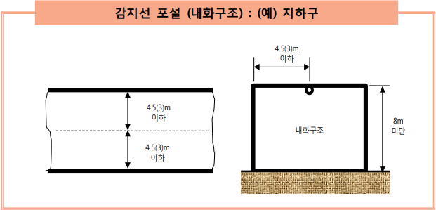 2.4.3.12.4 감지기와 감지구역의 각 부분과의 수평거리가 내화구조의 경우 1종 4.5 m 이하, 2종 3 m 이하로 할 것. 기타 구조의 경우 1종 3 m 이하, 2종 1 m 이하로 할 것