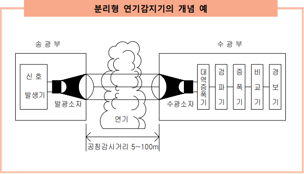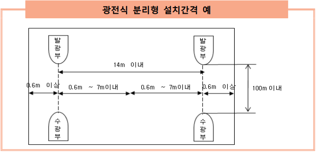 1. 광전식 분리형 감지기는 주위의 공기가 일정 농도 이상의 연기가 찿을때 작동하는 것으로 광범위 하게 연기가 누적되어감에 따라 광전소자의 수광량의 변화에 따라 작동하게 된다. 발광소자와 수광소자가 거리를 두고 떨어져 있는 것과 발광소자와 수광소자가 함께 있고 반대편 위치에 특수 거울을 이용하여 광이 수광 소자로 되돌아와 작동하는 것이 있다.감지기의 수광면을 직사광이 있는 장소에 설치하면 화재로 인한 연기가 발생하여도 감지기가 정상적인 상태로 착각하는 현상이 나타나 화재를 유효하게 감지하지 못한다. 그러므로 수광부는 햇볕이 직접 비쳐지는 곳을 피하여 설치하여야 한다. 광전식분리형 감지기는 송광부와 수광부가 서로 분리되어 마주보게 설치한 후 송광부와 수광부사이에 연기가 체류하였을 때 작동하는 것과 송광부와 수광부를 일체형으로 설치하고 마주보는 반대편에는 거울형태의 반사판을 설치하여 송광부에서 송출한 적외선이 반사판에 맞아 되돌아오는 것을 이용하는 두가지 방식이 주로 사용되고 있다. 2. 송광부와 수광부사이에 방출되는 적외선 방출빔은 벽면에서 일정부분 이격시켜야 준공 후에 벽면에 부착되는 기구물로 인하여 광축이 장애를 받지않게 된다. 3. 광전식분리형감지기의 송광부와 수광부를 뒷벽으로부터 너무 멀리 이격시키면 송광부와 수광부 뒷부분에 대한 연기를 감지할 수가 없으므로 최대한 뒷벽에 가깝게 설치해야 한다.