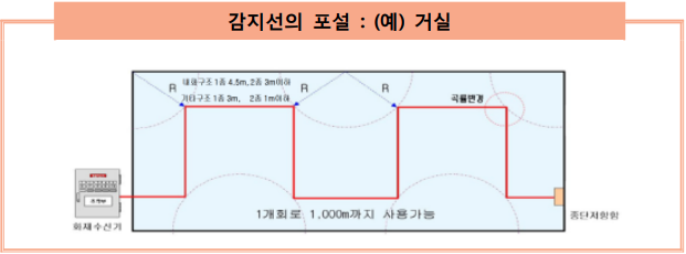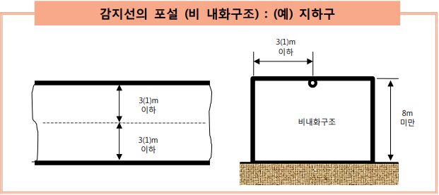 1. 지하구와 같이 좁고 긴 통로형태의 소방대상물에 감지선을 포설해야 하는 경우에는 내화구조인 경우에는 그림과 같이 설치하고 비내화구조인 경우에는 그림과 같이 감지선을 설치한다. 이 경우에는 감지기의 종별에 따라 감지범위가 달라 2종을 사용하는 경우에는 괄호안의 숫자를 적용해야 한다. 2. 지하구가 아닌 넓은 공간에 감지선형감지기를 설치해야 하는 경우에는 그림과 같이 모든 감지구역이 감지선의 범위에 속할 수 있도록 설치한다. 이그림에서의 R은 내화 또는 비내화구조, 1종 또는 2종에 따른 감지선형감지기가 감지할 수 있는 거리를 나타낸다.