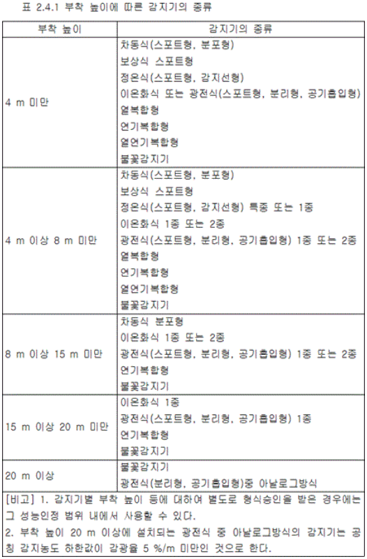 2.4.1 자동화재탐지설비의 감지기는 부착 높이에 따라 다음 표 2.4.1에 따른 감지기를 설치해야 한다.