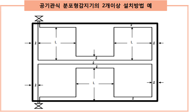 1. 하나의 검출부에 연결되는 공기관의 길이를 너무 길게 하면 감지구역이 너무 넓어져 실제 화재발생시 경계구역 내에 분포되어 있는 공기관이 전체적으로 약간의 온도가 상승하여도 공기가 팽창하여 접점이 구성되므로 오동작을 방지하기 위하여 길이를 제한하고 있다. 2. 따라서 넓은 지역에 공기관식 차동식분포형감지기를 설치하는 경우에는 그림에서 보는바와 같이 검출기를 추가하여 공기관의 길이가 100m 이내가 되도록 경계구역을 분할하여 설치한다. 3. 소방시설 자체 점검시 화재작동시험 등을 원활히 할 수 있도록 검출부에는 공기관의 설치 길이를 표기하는 것이 바람직하다. 4. 다음 그림의 왼쪽그림과 같이 공기관의 간격이 너무 넓게 하거나 간격이 골고루 분포되어 있지 않은 경우에는 화재 발생시 공기관 내부에 체류하고 있는 공기의 온도가 상승하는데 지장을 초래하게 되므로 감도특성에 적합한 공기의 팽창률을 기대하기가 어려우므로 오른쪽 그림과 같이 일정간격을 유지하여 공기관을 설치해야 한다.