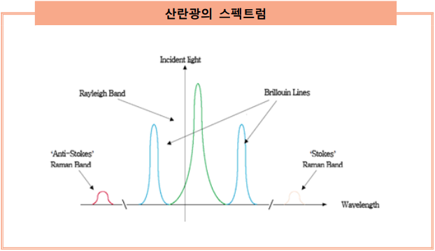 다. 작동원리 1) 빛을 광섬유에 입사할 경우, 광섬유 내의 Glass 격자들(SiO2)로 인해 빛의 산란,흡수등의 현상이 발생하며 산란광은 입사광과 동일한파장의 Rayleigh산란광, Brillouin 산란광과 Raman산란광으로 분리되고 광섬유내에서 입사광은 석영 분자에 흡수되어 열 진동의 횡파 모드를 발생시킨 후 재발광하여 광에너지를 잃으면서, 입사광보다 장파장의 Stokes광으로 변환되고, 횡파 모드를 흡수하고 재발광하여 광 에너지를 입사광보다 파장이 짧은 단파장의 Anti-Stokes광으로 변환된다. 2) Raman 산란광의 Stokes광과 Anti-Stokes광의 역 산란광 비율을 측정하여 매체의 절대온도를 측정 할 수 있으며, 광이 입사되고 난후에 산란광이 되돌아오는 시간을 계산하여 반사된 지점 확인한다.
