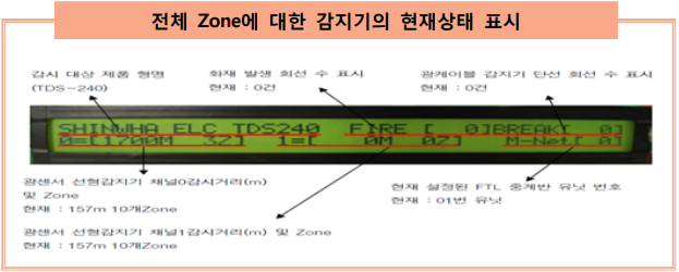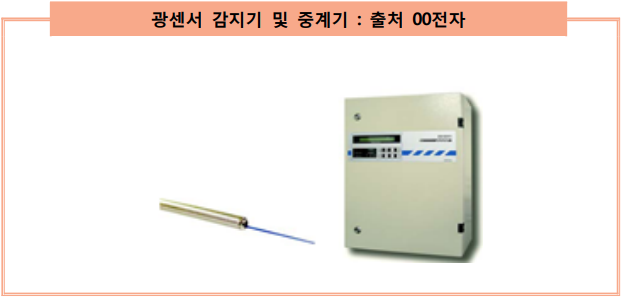 가. 광센서 감지선형감지기(00회사 참조) 광센서 선형감지시스템은 거리별 온도표시 (아날로그 감지기능), 작동온도(정온식, 차동식 또는두 가지의 혼용 감지 기능)와 경계구역의 임의 설정, 감지거리의 극대화가 가능하며 취약한 주변환경 조건에 대한 적응력이 강화되었다. 나. 구성 1) 광케이블(외관 - SUS, 광섬유 - 내열수지피복, Cladding, Core) 2) 중계기 및 R형수신