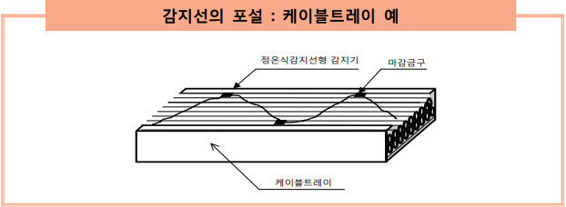 케이블트레이에는 트레이 내에 포설된 전선에서 화재가 발생할 경우를 대비하여 감지선형 감지기를 설치하는 것이므로 정온식 감지선형감지기를 그림과 같이 케이블과 근접하도록 지그재그형태로 설치하여야 케이블의 온도가 상승 하였을 때 쉽게 감지선이 용융되어 화재 초기에 감지가 가능하다.