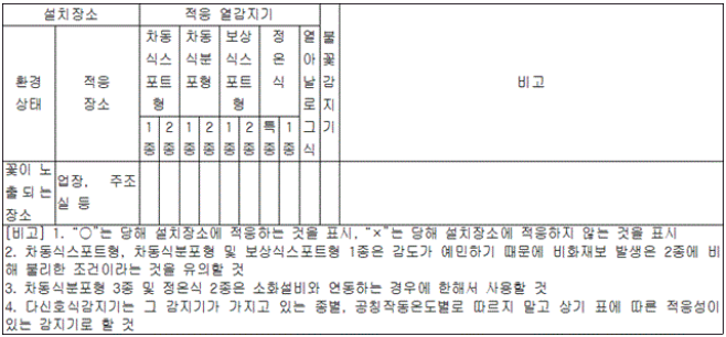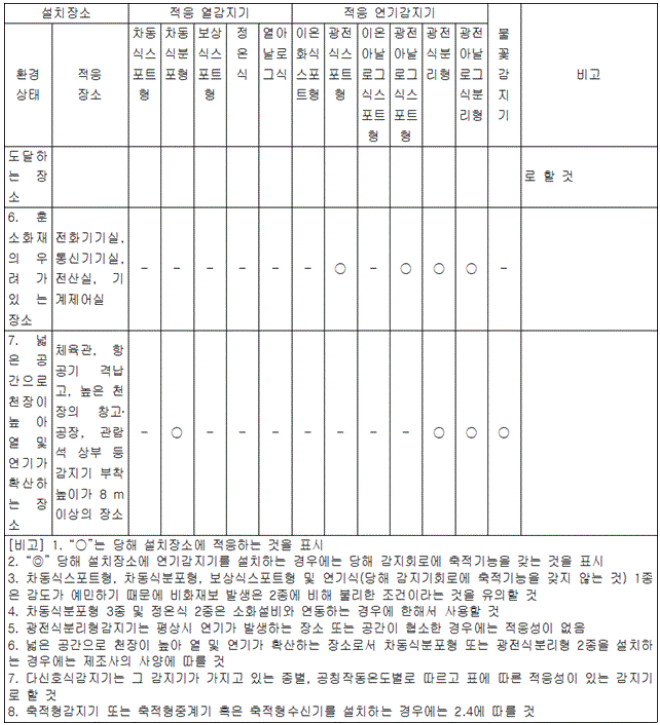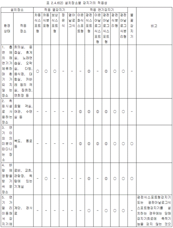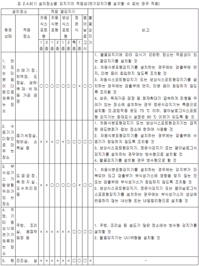 2.4.6 2.4.1 단서에도 불구하고 일시적으로 발생한 열ㆍ연기 또는 먼지 등으로 인하여 화재신호를 발신할 우려가 있는 장소에는 표 2.4.6(1) 및 표 2.4.6(2) 에 따라 해당 장소에 적응성 있는 감지기를 설치할 수 있으며, 연기감지기를 설치할 수 없는 장소에는 표 2.4.6(1)을 적용하여 설치할 수 있다.