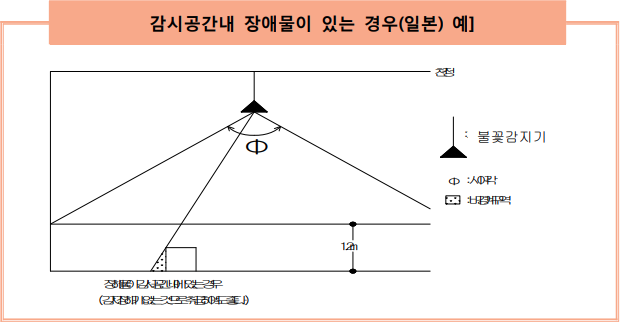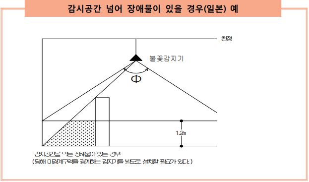 1. 열 또는 연기는 기류에 따라 이동되므로 장애물과 관계없이 동작되지만 불꽃감지기는 감지기의 위치에서 소방대상물을 볼 수 없는 지역에서 화재가 발생하는 경우에는 감지가 늦어지거나 감지를 할 수 없는 경우도 발생 할 수 있다. 따라서 일본에서는 1.2m를 초과하는 장애물이 있는 경우에는 불꽃감지기를 재배치하여 경계구역 전체를 감지할 수 있도록 정하고 있다. 2. 설치 방법(일본의 경우) 가. 천정 또는 벽 상부에 설치하여야 한다. 나. 벽에 의해서 구획된 구역별로 당해 구역의 바닥면에서 높이 1.2m까지의 공간 각 부분에서 당해 감지기까지의 거리가 공칭 감시 거리 범위내에 있도록 하여야 한다. 다. 감지기는 장해물이 있더라도 화재 발생을 감지할 수 있도록 설치하여야 한다.