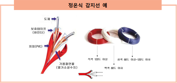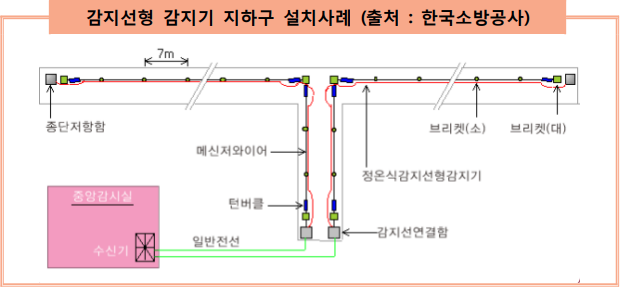 1. 지하구에 설치되는 감시선형은 발화지점을 확인 할 수 있도록 전용의 감지선형 수신기를 설치한다. 이 경우 거리표시 시험은 회로 말단의 종단저항을 분리하고 2선(회로,공통)을 단락시키면 전용수신기에서는 단락(화재)지점의 거리가 표시된다. 이 방법으로 1경계구역의 회로 길이의 적정여부 확인 및 거리표시 시험을 동시에 할 수 있다. 단, 지하구에 설치되는 감지선형이 아닌 경우는 종단저항을 단락시켜 회로 확인을 한다. 2.정온식 감지선형 감지기는 공칭작동온도에 따라서 색상으로 구분한다.가. 80℃ 이하 –백색나. 80℃이상 120℃이하 - 청색다. 120℃이상 - 적색