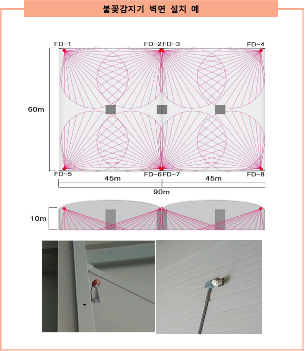 1. 불꽃감지기는 경계구역을 구성하는 대상에 따라 감지대상면적, 천장의 구조 및 소방대상물의 배치에 따라 벽면 또는 천장면에 감지기를 설치한다.불꽃감지기는 설치장소 및 높이에 따라 감지영역에 많은 차이가 발생하므로 방호대상지역의 설치여건과 면적 등을 고려하여 불꽃감지기가 가지고 있는 사양에 따라 설치한다. 2. 감지기 설치 장소의 천장이 높으면 천장면에서 설치시 공칭감지면적이 넓어져 유리하고, 천장인 낮으면 벽 또는 모서리에 설치시 공칭감지면적이 넓어져 유리하다. 다만, 같은 높이의 장애물이라도 천장면에 설치시 사공간(Dead Space)이 줄어든다.
